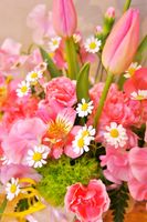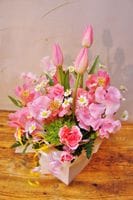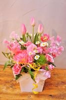 ■使用花材 : チューリップ・スイトピー・カーネーション・アルストロメリア・季節の小花・カールリボン