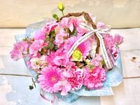 ■使用花材 : ガーベラ・スイートピー・カーネーション・トルコキキョウ・季節のグリーン・不織布・コットンリボン