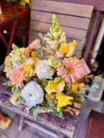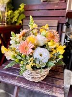 〜春の陽ざしを感じるやさしい色合いの花々を、自然素材のバスケットに丁寧にデザインしました。〜